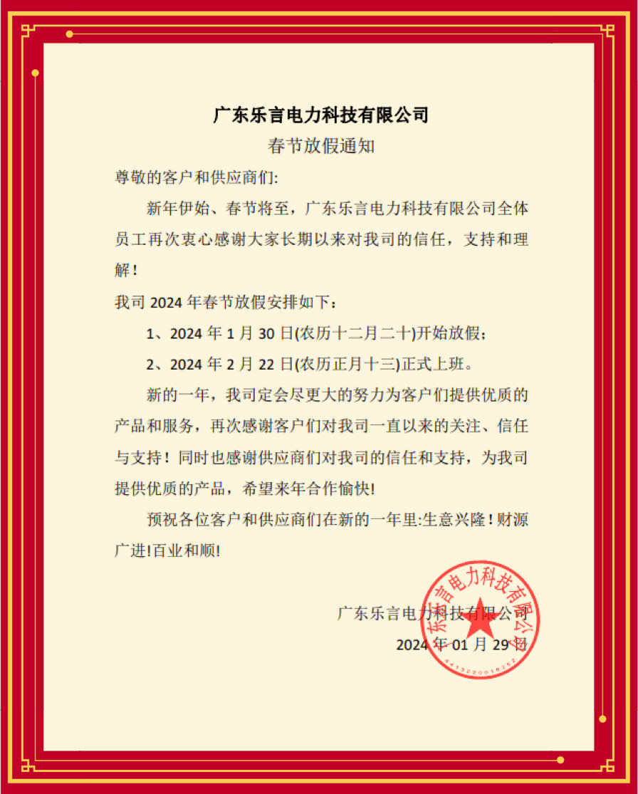 新年伊始、春節(jié)將至,廣東樂(lè)言電力科技有限公司全體員工再次衷心感謝大家長(zhǎng)期以來(lái)對(duì)我司的信任,支持和理解!